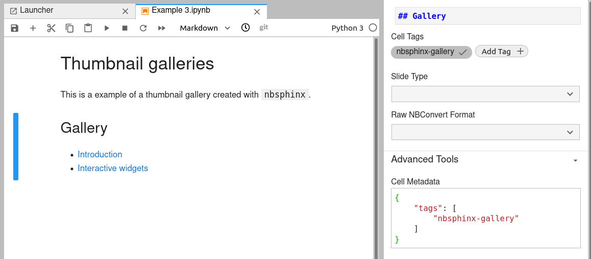 "nbsphinx-gallery"tag to the metadata of a cell. Each editor has a different way of modifying the cell metadata (see figure below).
